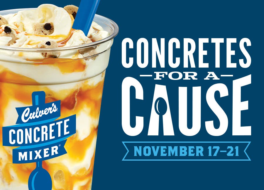 We’re proud to share that Culver’s has raised over $1.7 million for local food banks through Concretes for a Cause. Help us continue to make an impact. From November 17th through 21st, when you buy any Concrete Mixer®, Culver’s will donate $1 to help feed a family in need in your community.
